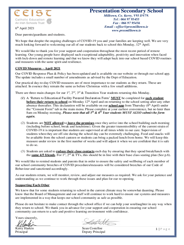 Presentation Secondary School 6th April 2021Milltown, Co. Kerry, V93 DV79. Tel : 066 97 95455 Fax : 066 97 95456 Email : office@presmilltown.ie www.presmilltown.ieDear parents/guardians and students.