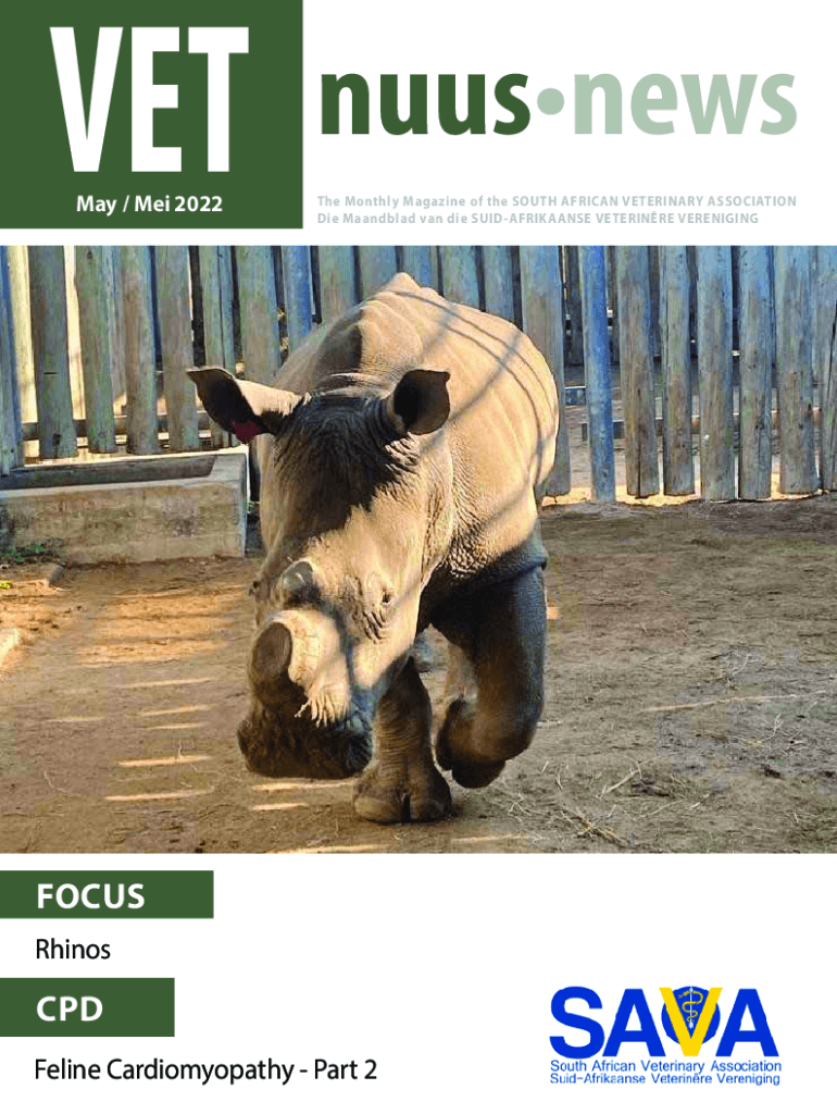 VET May / Ma 2022nuusnews The Monthly Magazine of the SOUTH AFRICAN VETERINARY ASSOCIATION Die Mandela van die SUIDAFRIKAANSE VETERINARY VERENIGINGFOCUS Rhinos CPD Feline Cardiomyopathy Part 2LETS