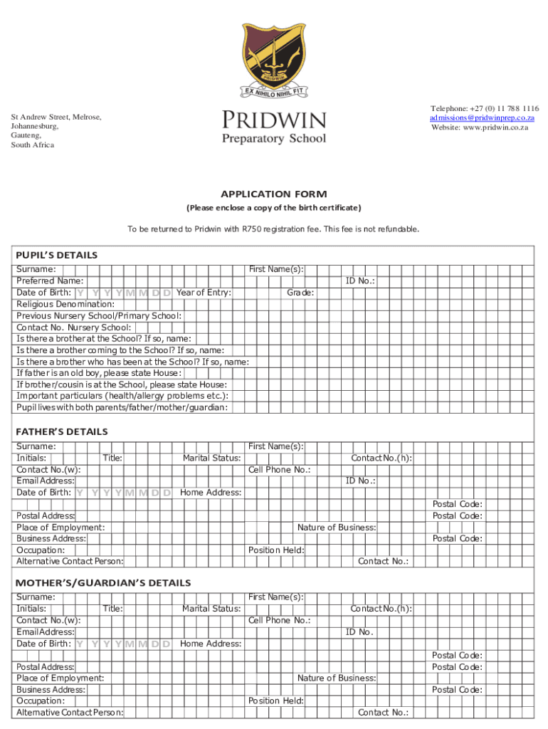 Telephone: +27 (0) 11 788 1116 admissions@pridwinprep.co.za Website: www.pridwin.co.zaSt Andrew Street, Melrose, Johannesburg, Gluten, South AfricaAPPLICATION FORM (Please enclose a copy of the birth