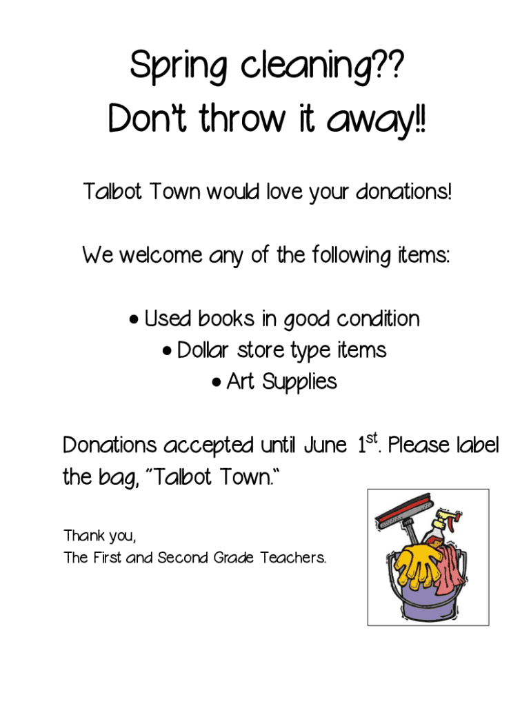 Spring-cleaning?? Don't throw it away!! Talbot Town would love your donations! We welcome any of the following items: Used books in good condition Dollar store type items Art Supplies Donations accepted