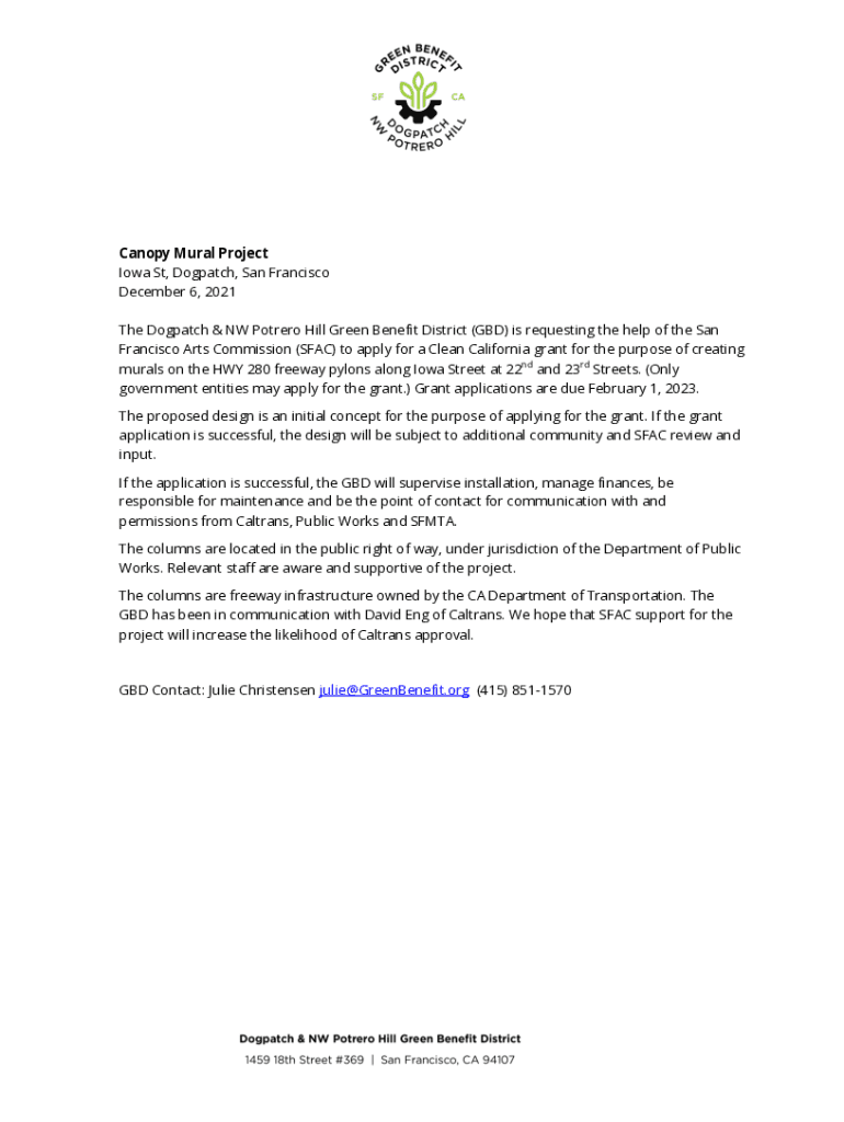 Canopy Mural Project Iowa St, Dog patch, San Francisco December 6, 2021, The Dog patch & NW Pottery Hill Green Benefit District (GOD) is requesting the help of the San Francisco Arts Commission (SAC)