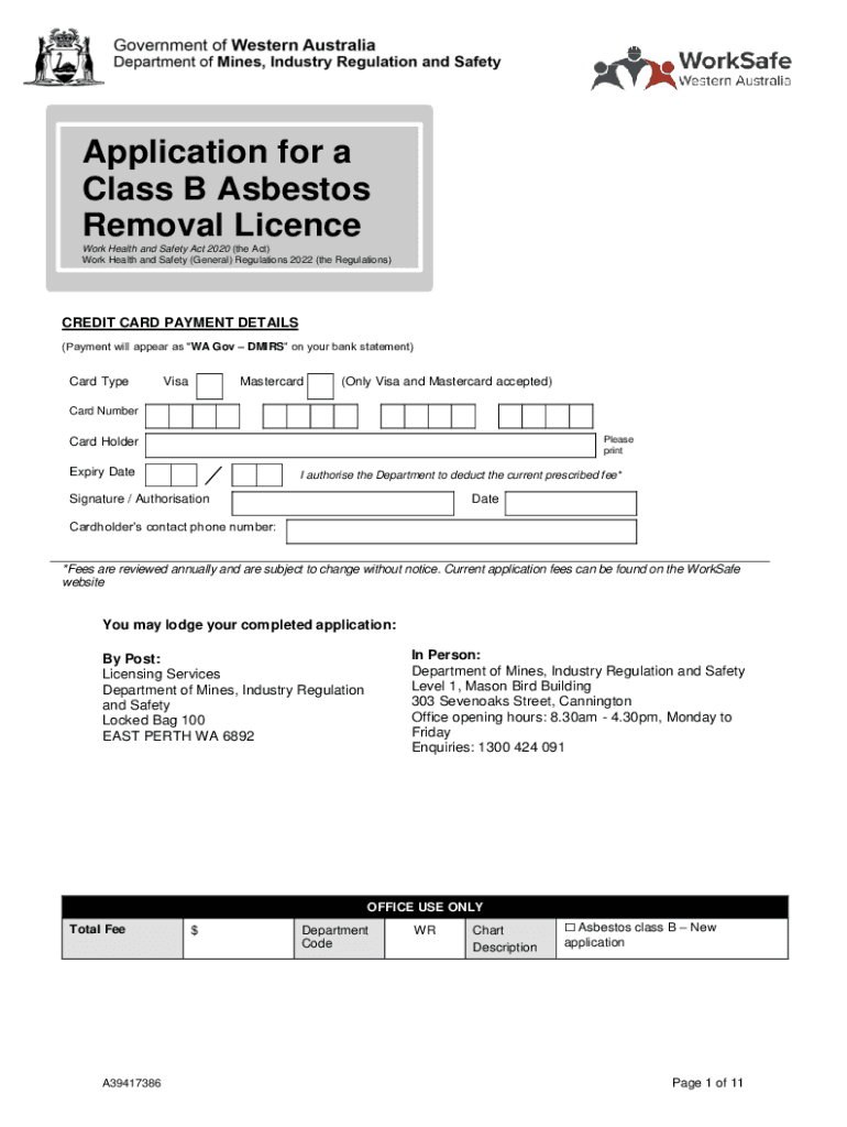 Application for a Class B Asbestos Removal License Work Health and Safety Act 2020 (the Act) Work Health and Safety (General) Regulations 2022 (the Regulations)CREDIT CARD PAYMENT DETAILS (Payment