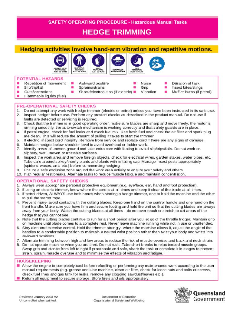 Instructions for the form HMT hedge trimming Safe Operating Procedure. HMT hedge trimming Safe Operating Procedure - education qld gov