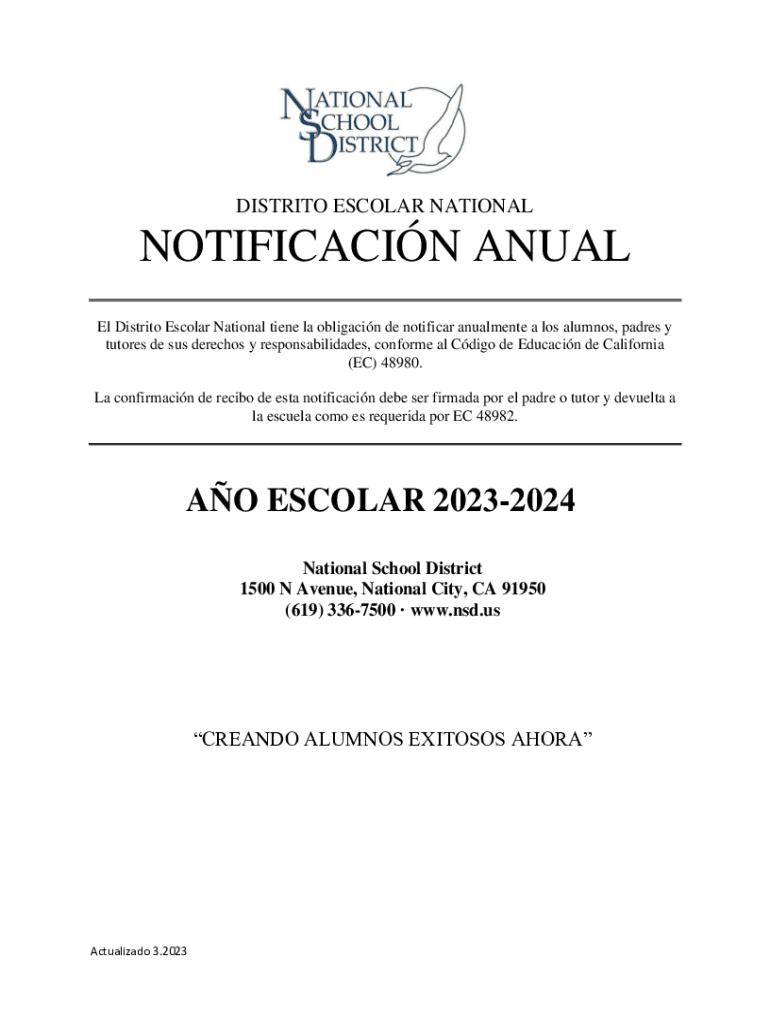 POOL DISTRICT ESCOLAR NATIONALNOTIFICACIN ANNUAL El District Escolar National Taine la obligation DE notifier annulment a Los alumnus, padres y tutors DE SUS searches y responsabilidades, conform
