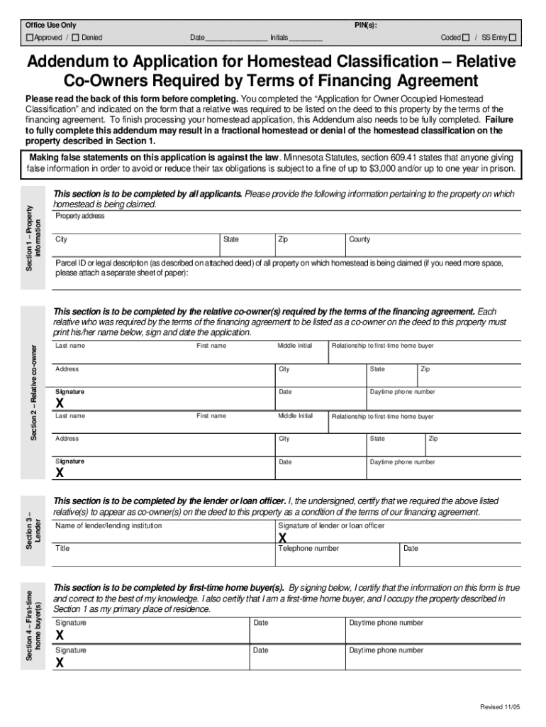 Office Use Only Approved /PIN(s): Denigrate ___ Initials ___Coded/ SS EntryAddendum to Application for Homestead Classification Relative Owners Required by Terms of Financing Agreement Please read