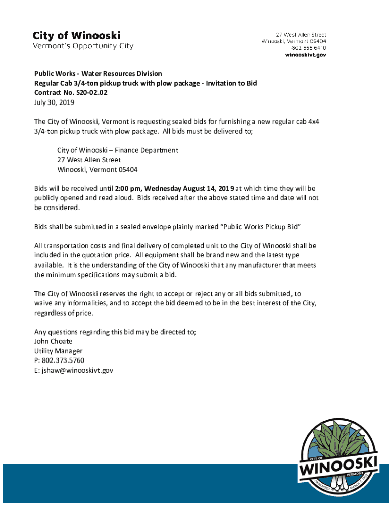 PublicWorksWaterResourcesDivision RegularCab3/4tonpickuptruckwithplowpackageInvitationtoBid Contract No. S2002.02 July30,2019 TheCityofWinooski,Vermontisrequestingsealedbidsforfurnishinganewregularcab4x4