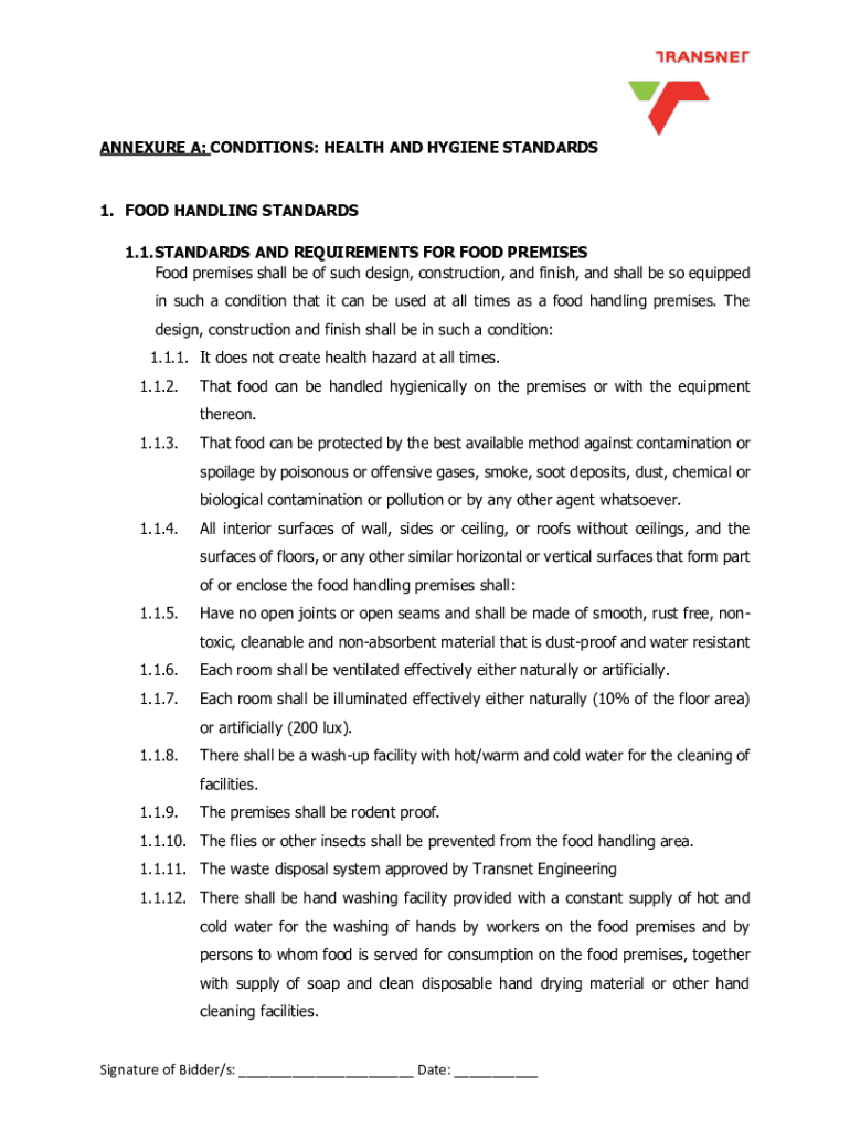Appendix A: CONDITIONS: HEALTH AND HYGIENE STANDARDS1. FOOD HANDLING STANDARDS 1.1. STANDARDS AND REQUIREMENTS FOR FOOD PREMISES shall be of such design, construction, and finish, and shall be so
