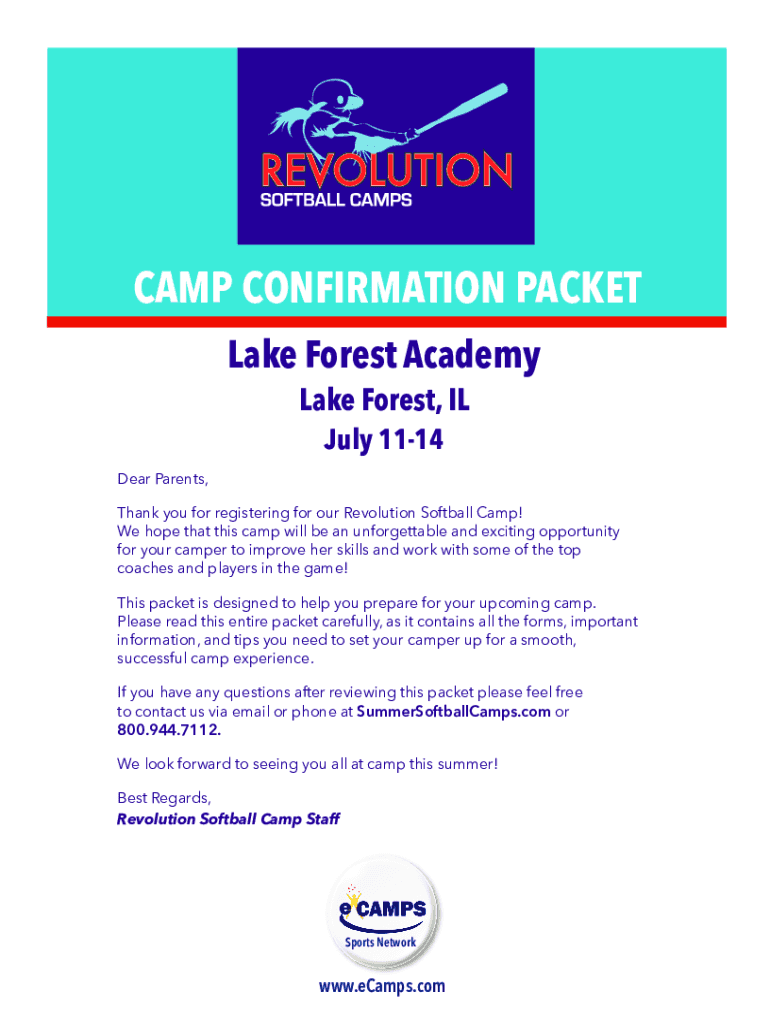 CAMP CONFIRMATION PACKET Lake Forest Academy Lake Forest, IL July 1114 Dear Parents, Thank you for registering for our Revolution Softball Camp! We hope that this camp will be an unforgettable and