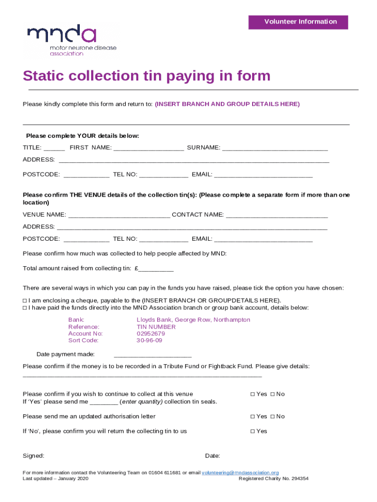 Frequently asked questions about the form Static collection tin paying in - MND Association