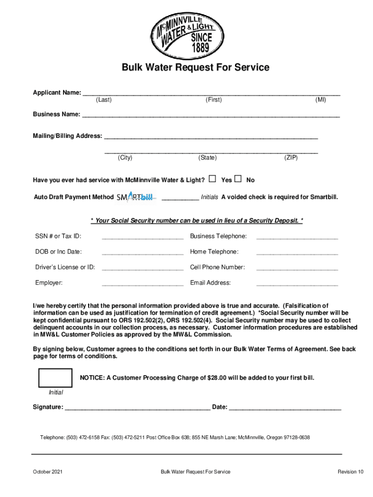 Bulk Water Request For Service Applicant Name: ___ (Last) (First) (MI) Business Name: ___Mailing/Billing Address: ___ ___ (City) (State) (ZIP)Have you ever had service with McMinnville Water & Light?