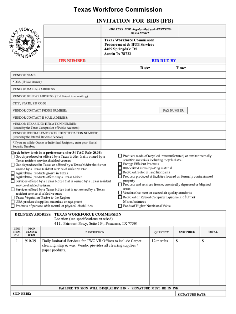 Texas Workforce Commission INVITATION FOR BIDS (IF) ADDRESS FOR Regular Mail and EXPRESSOVERNIGHTTexas Workforce Commission Procurement & HUB Services 4405 Springdale Rd Austin TX 78723BID DUE BYI