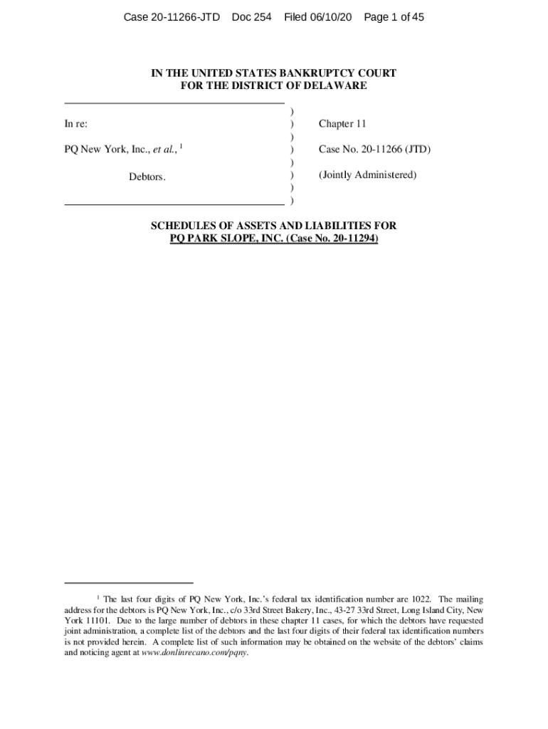 Case 2011266JTDDoc 254Filed 06/10/20Page 1 of 45IN THE UNITED STATES BANKRUPTCY COURT FOR THE DISTRICT OF DELAWARE ___) In re:) Chapter 11)) Case No. 2011266 (LTD) PQ New York, Inc., et al., 1)) (Jointly