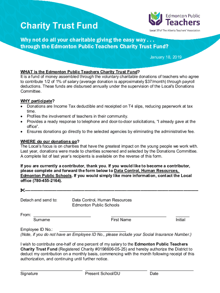 Charity Trust Fund Why not do all your charitable giving the easy way. . . Through the Edmonton Public Teachers Charity Trust Fund? January 18, 2019, WHAT is the Edmonton Public Teachers Charity Trust