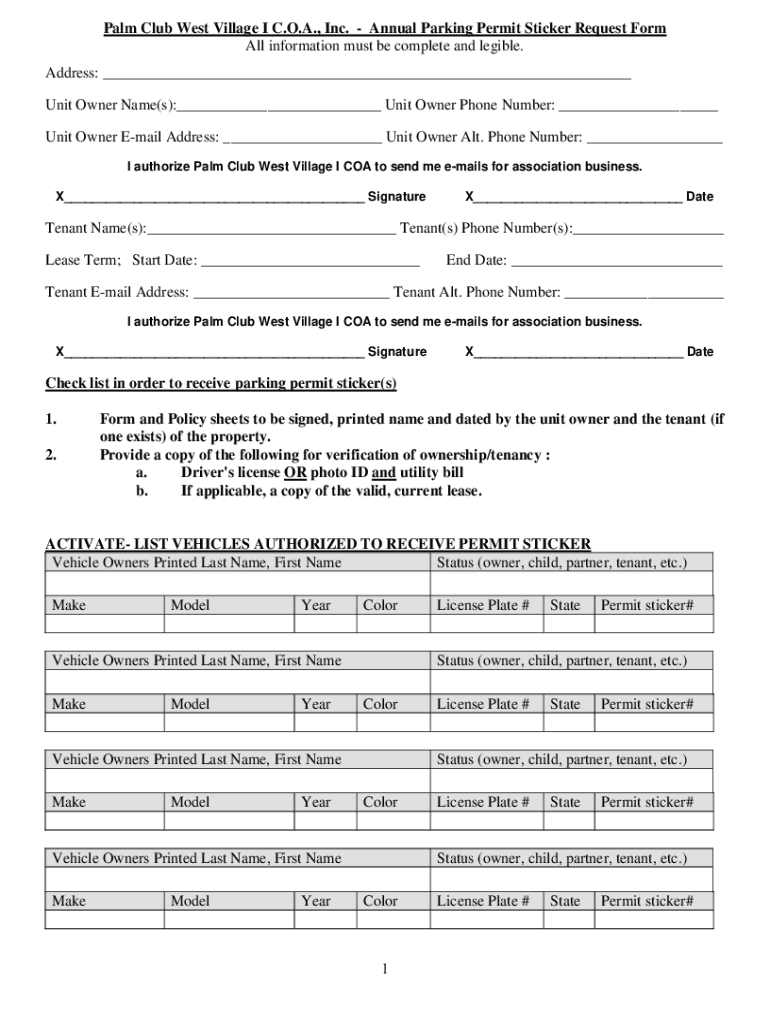 Palm Club West Village I C.O.A., Inc. Annual Parking Permit Sticker Request Form All information must be complete and legible. Address: ___ Unit Owner Name(s):___ Unit Owner Phone Number: ___ Unit