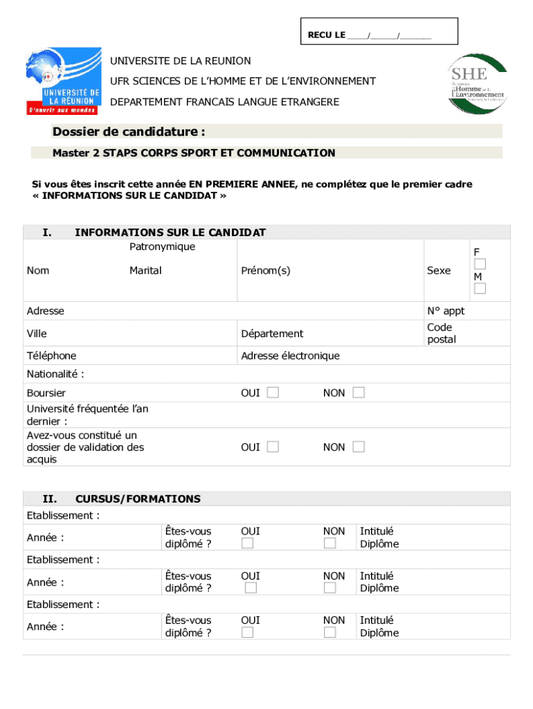 RECUR LE ___/___/___UNIVERSITY DE LA REUNION UFR SCIENCES DE HOME ET DE ENVIRONMENT DEPARTMENT FRANÇAIS LAN GUE ETRANGEREDossier de candidature : Master 2 STAPS CORPS SPORT ET COMMUNICATION Si vows