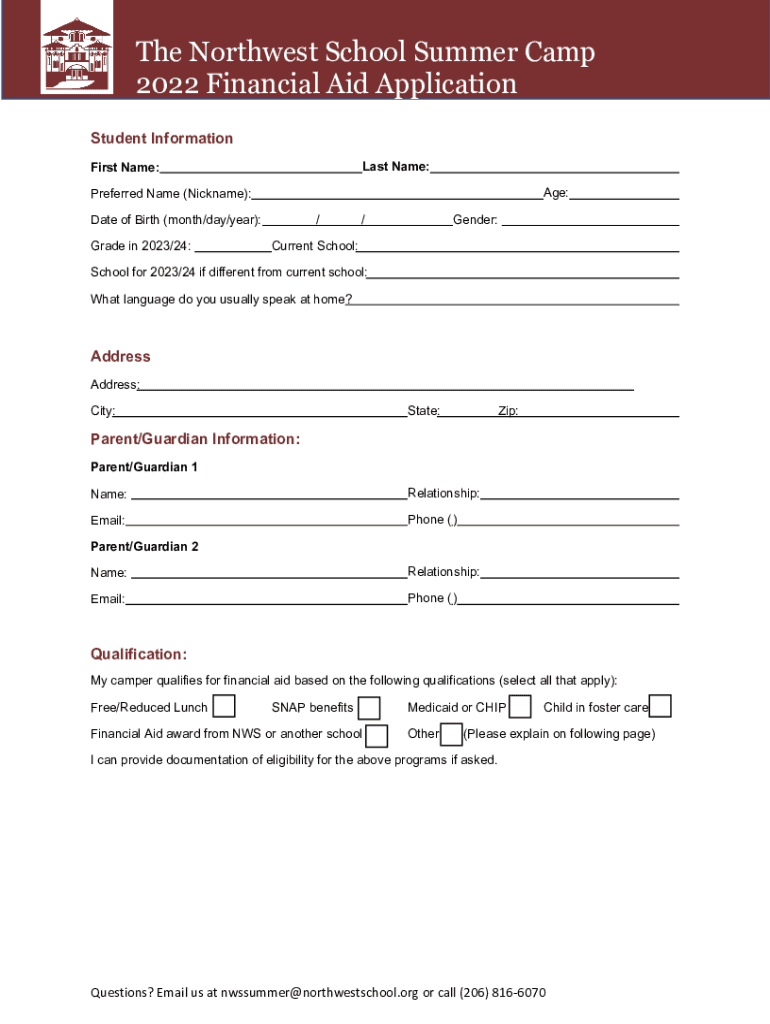 The Northwest School Summer Camp 2023 Financial Aid Application Summer Camp Financial Aid The Northwest School awards financial aid based on the need of the family. If you are a current or incoming