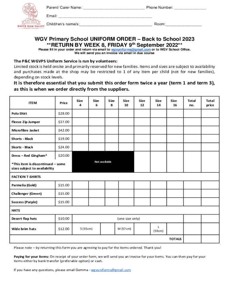 Parent/ Carer Name: ___ Phone Number: ___ Email: ___ Child/runs name/s:___ Room:___AGV Primary School UNIFORM ORDER Back to School 2023 **RETURN BY WEEK 8, FRIDAY 9th September 2022** Please fill