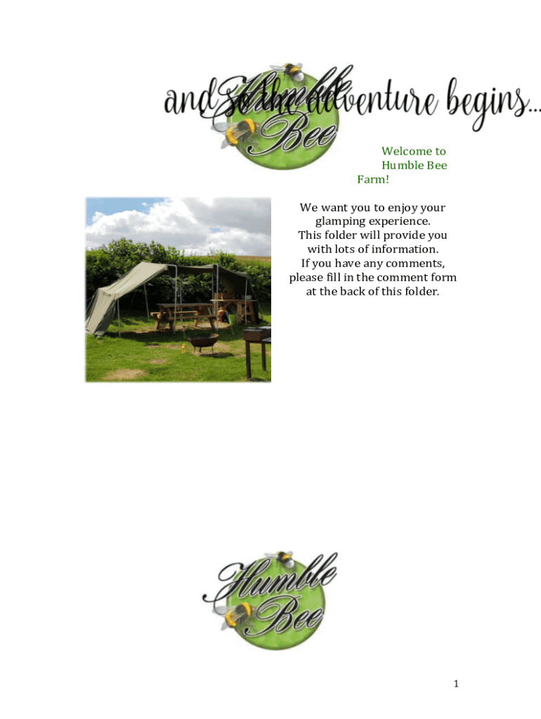 Welcome to humble Bee Farm! We want you to enjoy yourglamping experience. This folder will provide you with lots of information. If you have any comments, please fill in the comment format the back