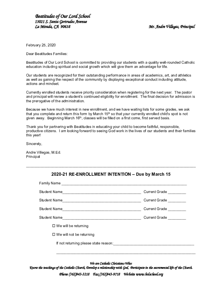 Beatitudes of Our Lord School13021 S. Santa Gertrude's Avenue La Mirada, CA 90638Mr. Andre Villegas, Principal February 25, 2020, Dear Beatitudes Families: Beatitudes of Our Lord School is committed