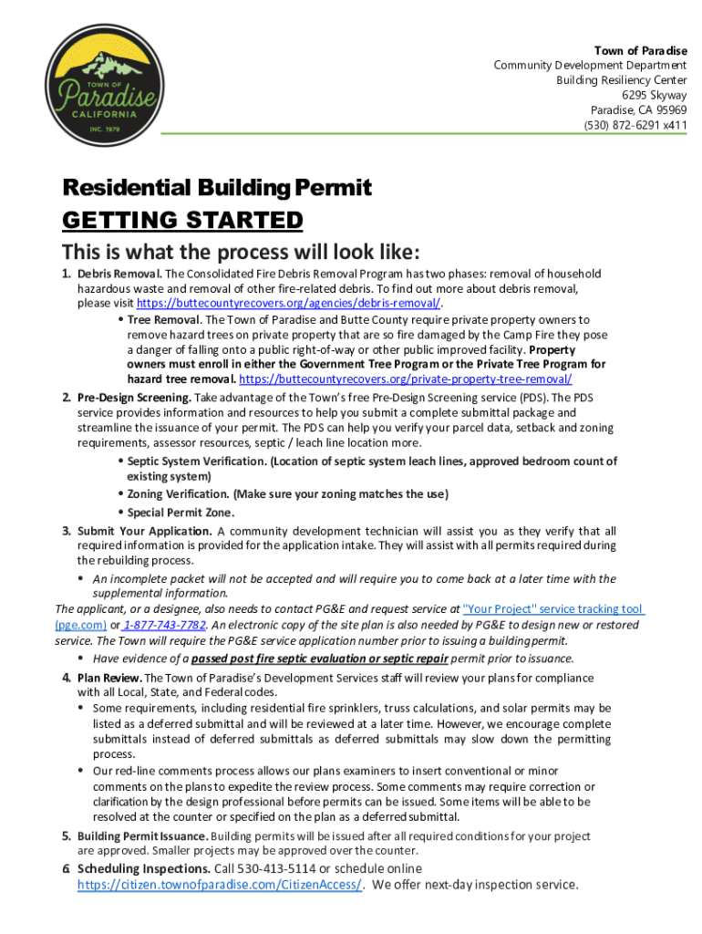 Town of Paradise Community Development Department Building Resiliency Center 6295 Skyway Paradise, CA 95969 (530) 8726291 x411Residential Building Permit GETTING STARTED This is what the process will