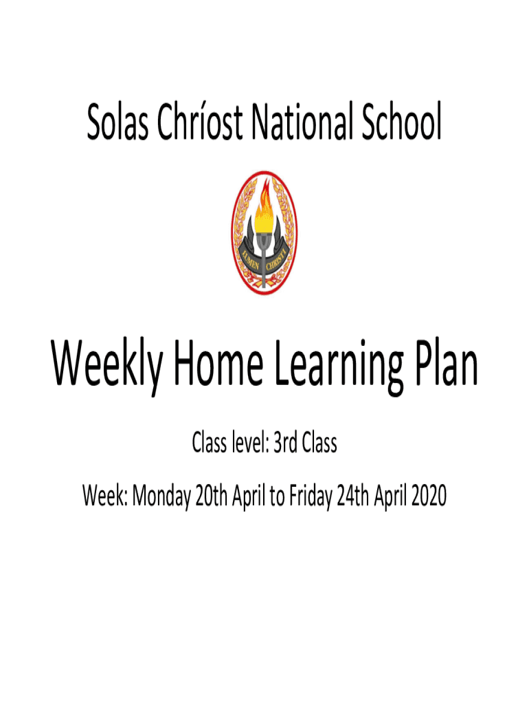 Solar Christ National SchoolWeekly Home Learning Plan Class level: 3rd Class Week: Monday 20th April to Friday 24th April 2020Maths Ms. Harris Class This week we will be learning about 2D & 3D shapes