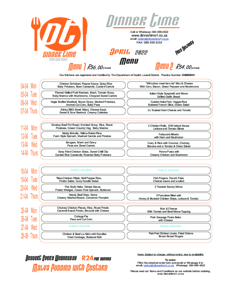 ___ Time ___ Dinner Call or WhatsApp: 0840994622www.dinnertime1.co.ZA email: orders@dinnertime1.co.zaFAX: 086 538 3333Menu 1 R56.00April 2022 Menu/mealy I've l e ed Bremen 2 R54.00p/mealOur Kitchens