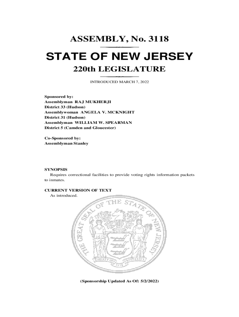 ASSEMBLY, No. 3118STATE OF NEW JERSEY 220th LEGISLATURE INTRODUCED MARCH 7, 2022Sponsored by: Assemblyman RAJ MUKHERJEE District 33 (Hudson) Assemblywoman ANGELA V. McKnight District 31 (Hudson) Assemblyman