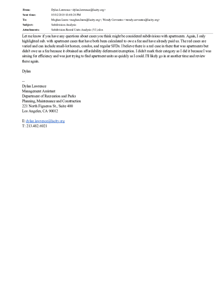 From:Dylan Lawrence dylan.lawrence@lacity.orgSent time:05/02/2019 03:49:20 PTO:Meghan Lu era meghan.luera@lacity.org Wendy Cervantes wendy.cervantes@lacity.orgSubject:Subdivision AnalysisAttachments:Subdivision