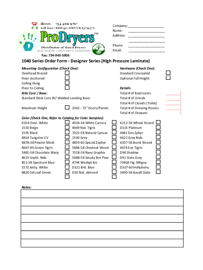 Company:___ Name: ___ Address: ___ ___ Phone: ___ Email: ___ Fax: 73494359061040 Series Order Form Designer Series (High Pressure Laminate) Mounting Configuration (Check One): Overhead Braced Floor