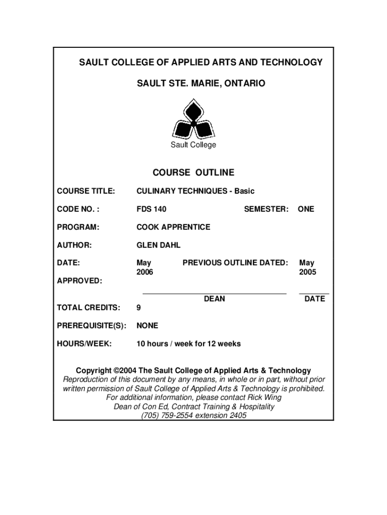 COURSE TITLE:CULINARY TECHNIQUES Barcode NO. FDS 140PROGRAM:COOK APPRENTICEAUTHOR:GLEN MANDATE:May