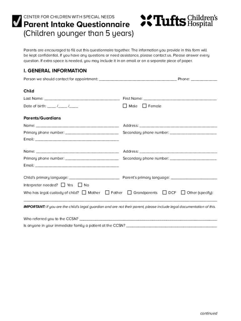 Get the free Parent Intake Questionnaire (Children younger than 5 years) - Tufts ...