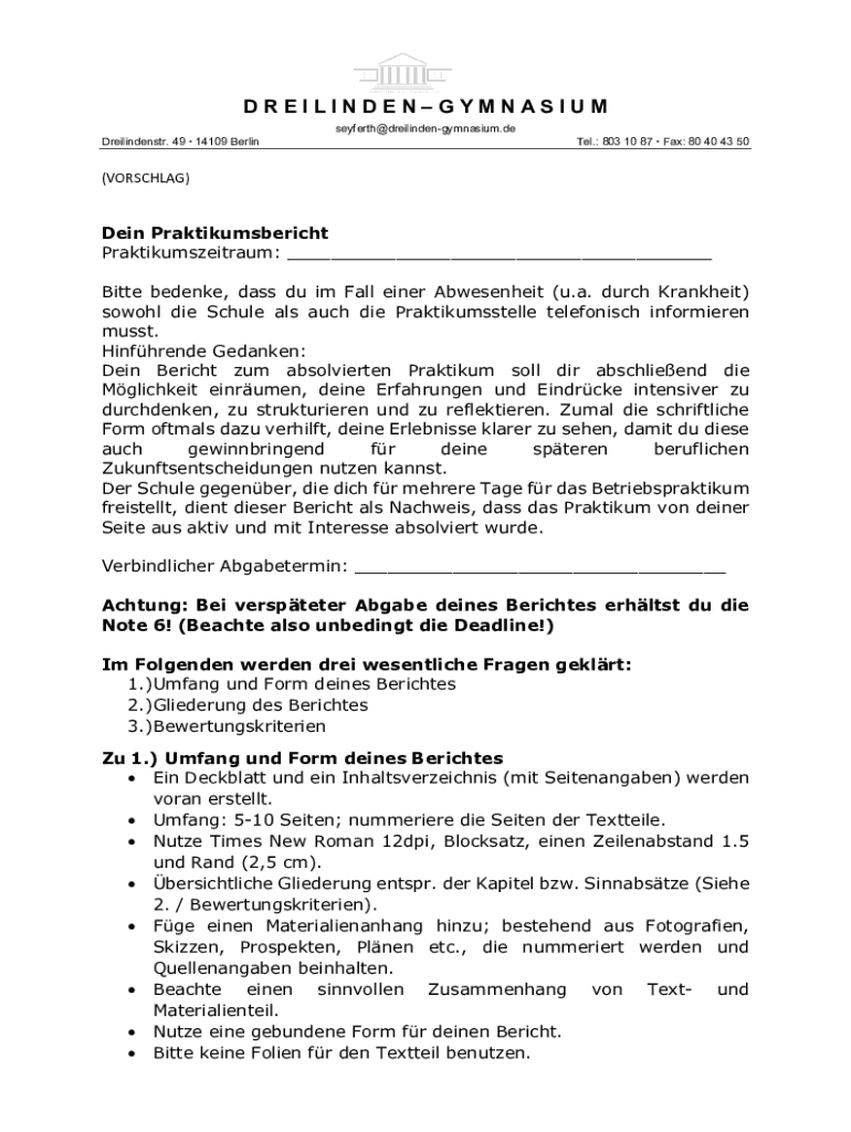 Dreilindenstr. 49 14109 Berliner.: 803 10 87 Fax: 80 40 43 50(VORSCHLAG)Dan Praktikumsbericht