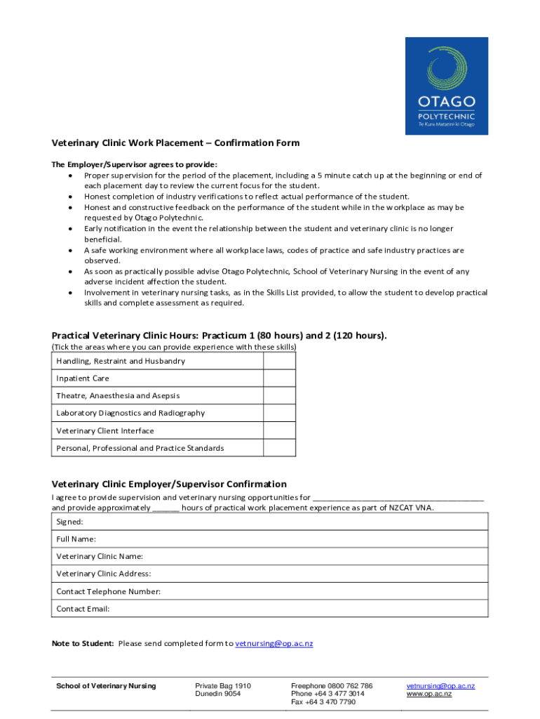Veterinary Clinic Work Placement Confirmation Form The Employer/Supervisor agrees to provide: Proper supervision for the period of the placement, including a 5-minute catch up at the beginning or