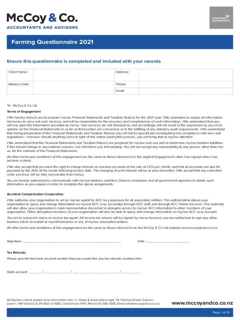 Farming Questionnaire 2021 Ensure this questionnaire is completed and included with your records Client Name:Address:Balance Date:Phone: Email:To: McCoy & Co Ltd Terms of Engagement I/We hereby instruct