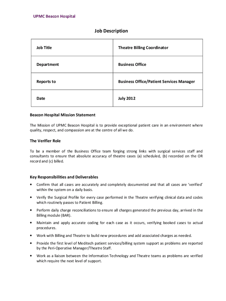 Get the free Job Title Theatre Billing Coordinator Department Business ... - www2 beaconhospital
