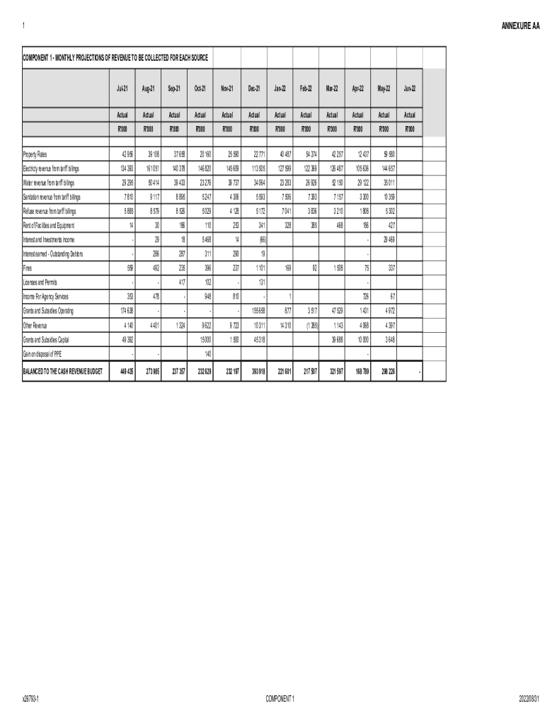 1ANNEXURE COMPONENT 1 MONTHLY PROJECTIONS OF REVENUE TO BE COLLECTED FOR EACH SOURCEProperty RatesJul21Aug21Sep21Oct21Nov21Dec21Jan22Feb22Mar22Apr22May22Jun22ActualActualActualActualActualActualActualActualActualActualActualActualR\'000R\'000R\'000R\'000R\'000R\'000R\'000R\'000R\'000R\'000R\'000R\'00042