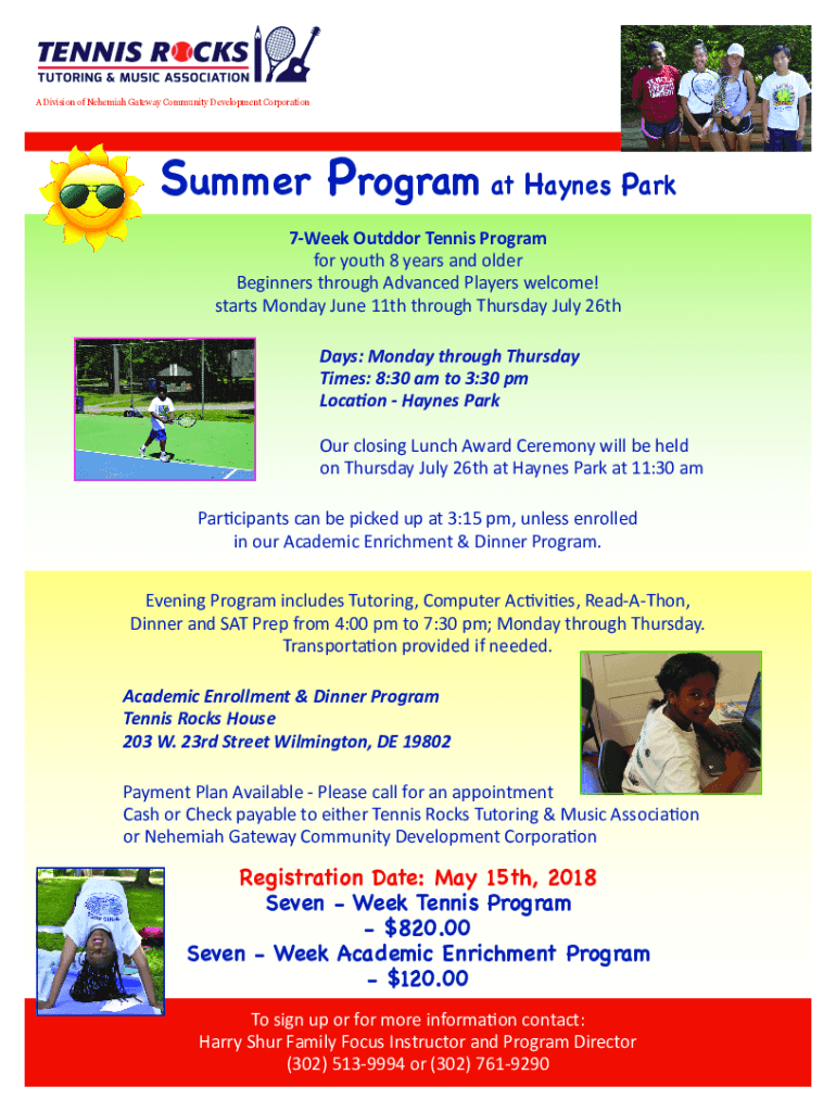 A Division of Nehemiah Gateway Community Development Corporation Summer Program at Haynes Park 7Week Outdoor Tennis Program for youth 8 years and older Beginners through Advanced Players welcome!