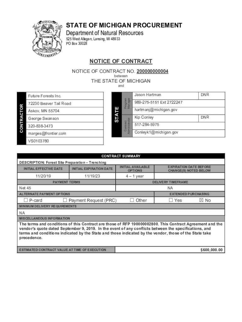STATE OF MICHIGAN PROCUREMENT Department of Natural Resources 525 West Alleged, Lansing, MI 48933 PO Box 30028NOTICE OF CONTRACT NOTICE OF CONTRACT NO. 200000000004. Between STATE OF MICHIGAN Andropov,