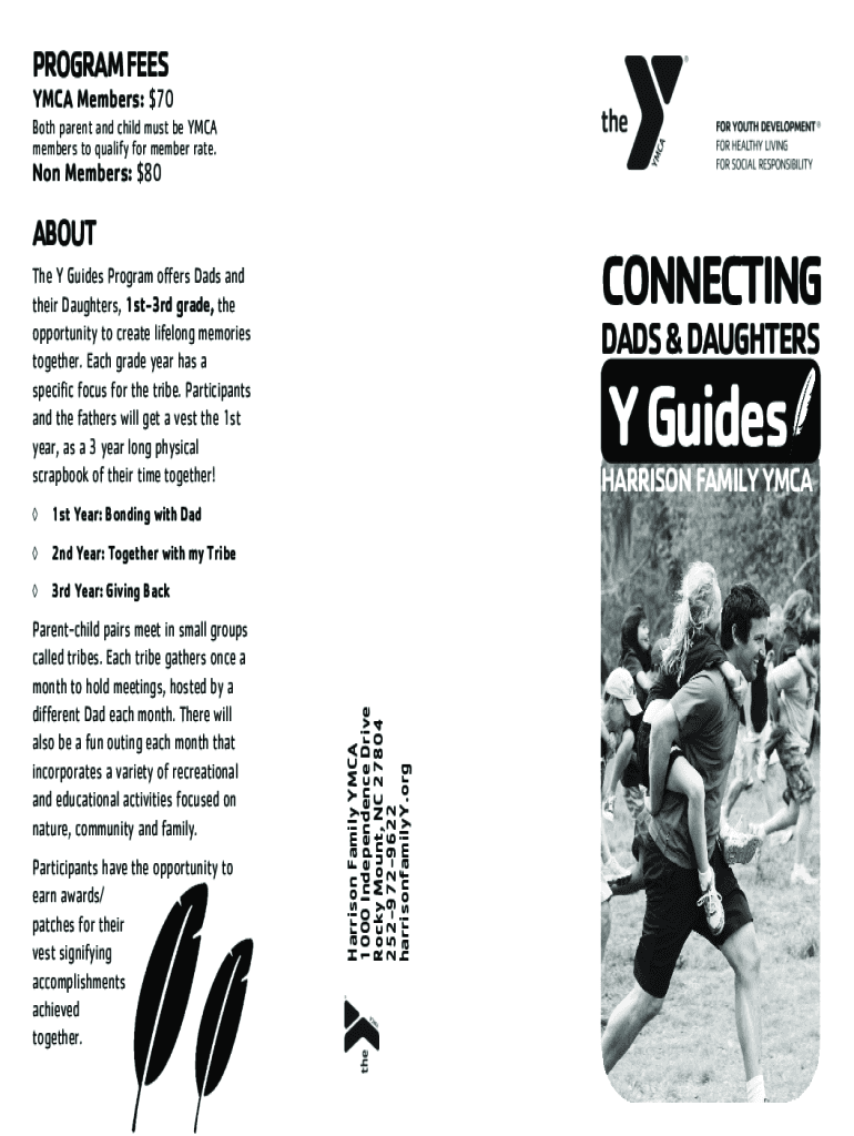 PROGRAM FEES YMCA Members: $70 Both parent and child must be YMCA members to qualify for member rate. Non Members: $80ABOUTCONNECTINGThe Y Guides Program offers Dads and their Daughters, 1st3rd grade,