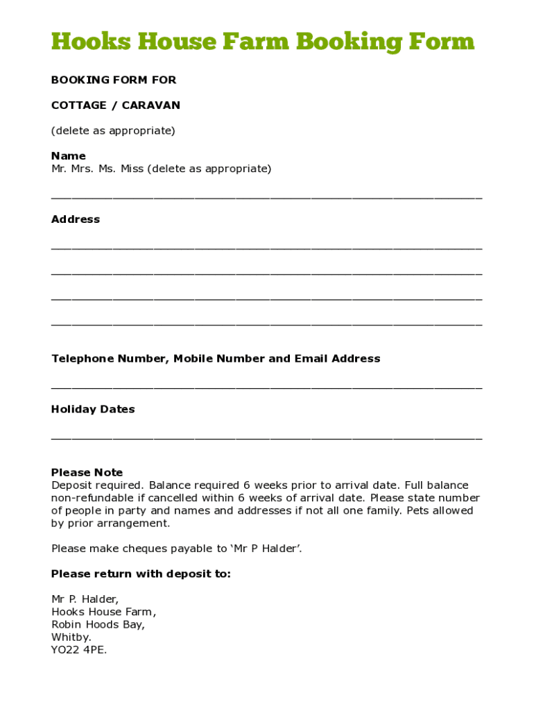 Hooks House Farm Booking Form FOR COTTAGE / CARAVAN (delete as appropriate) Name Mr. Mrs. Ms. Miss (delete as appropriate) ___ Address ___ ___ ___ ___Telephone Number, Mobile Number and Email Address