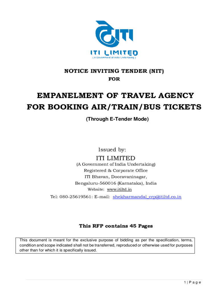 NOTICE INVITING TENDER (NIT) FOREMPANELMENT OF TRAVEL AGENCY FOR BOOKING AIR/TRAIN/BUS TICKETS (Through Tender Mode)Issued by:IT LIMITED (A Government of India Undertaking) Registered & Corporate