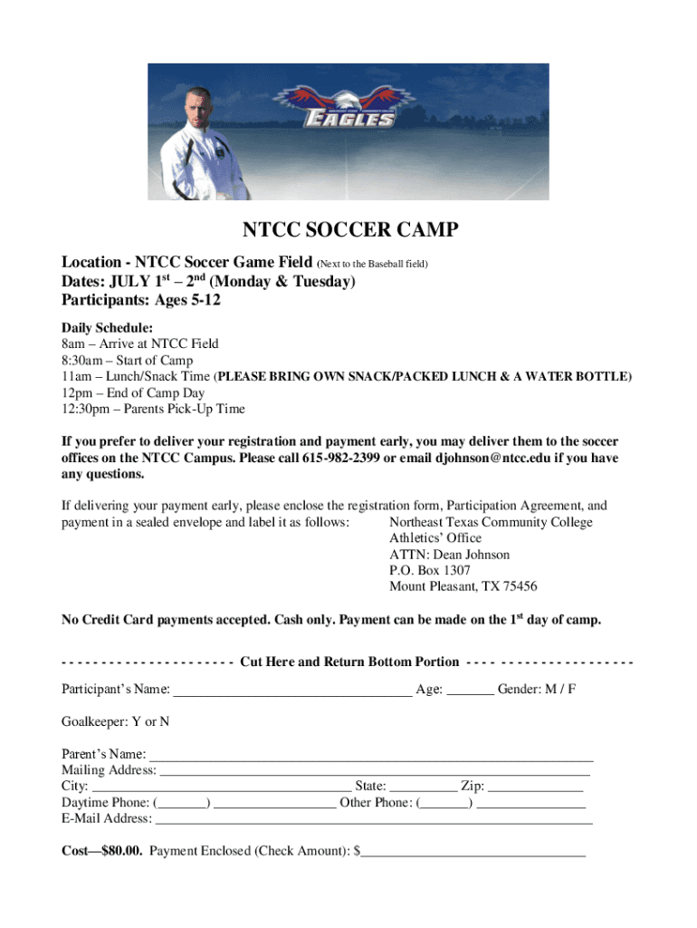 NTSC SOCCER CAMP Location NTSC Soccer Game Field (Next to the Baseball field) Dates: JULY 1st 2nd (Monday & Tuesday) Participants: Ages 512 Daily Schedule: 8am Arrive at NTSC Field 8:30am Start of