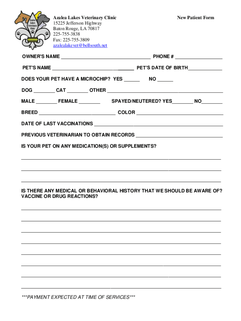 Azalea Lakes Veterinary Clinic 15225 Jefferson Highway Baton Rouge, LA 70817 2257553838 Fax: 2257553809 azalealakevet@bellsouth.netNew Patient Former\'S NAME ___ PHONE # ___ PET\'S NAME ___ PETS DATE