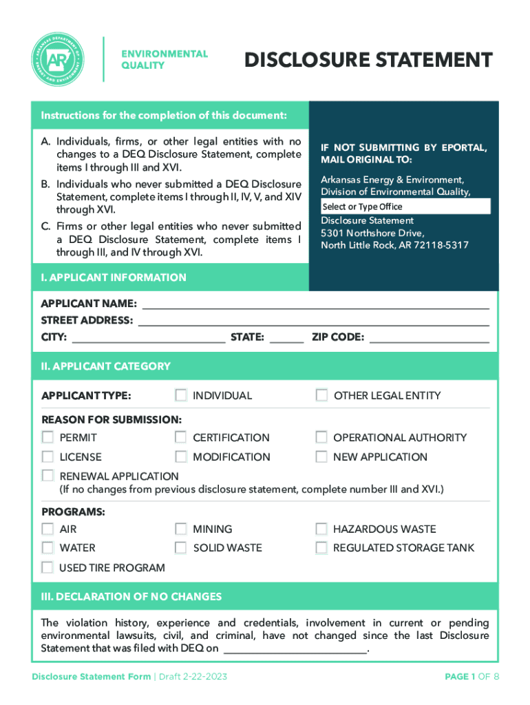 INSTRUCTIONS FOR DISCLOSURE STATEMENT Arkansas Code Annotated Section 81106 requires that all applicants for the issuance, or transfer of any permit, license, certification, or operational authority