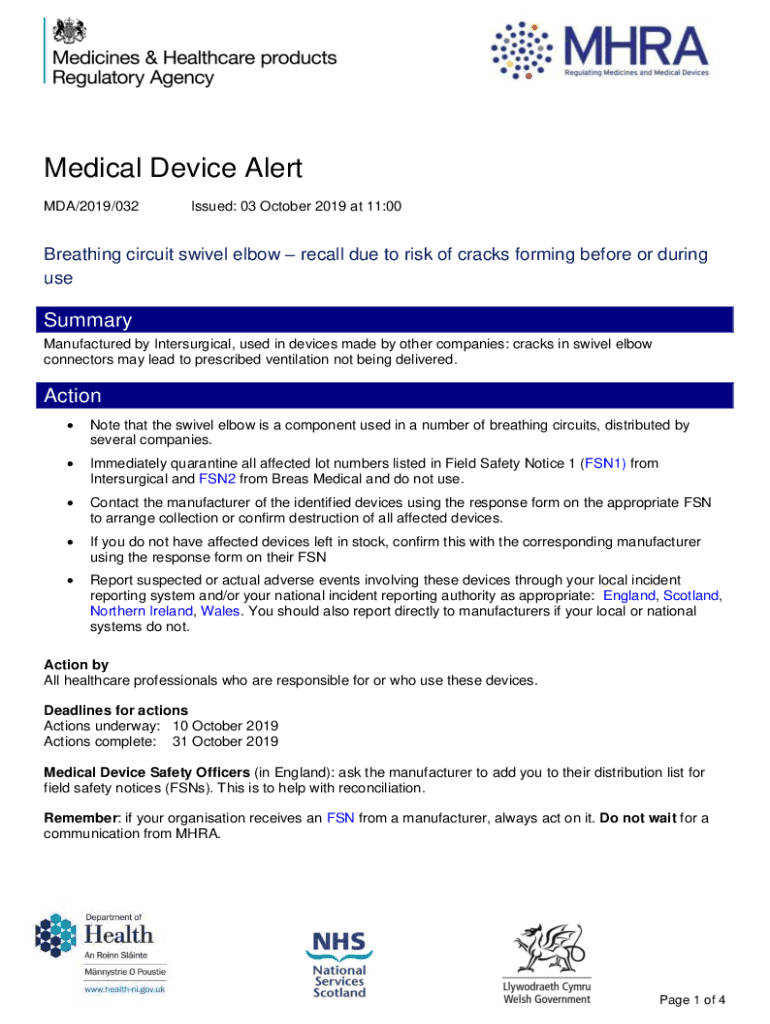 Medical Device Alert MDA/2019/032Issued: 03 October 2019 at 11:00Breathing circuit swivel elbow recall due to risk of cracks forming before or during summary Manufactured by Intersurgical, used in