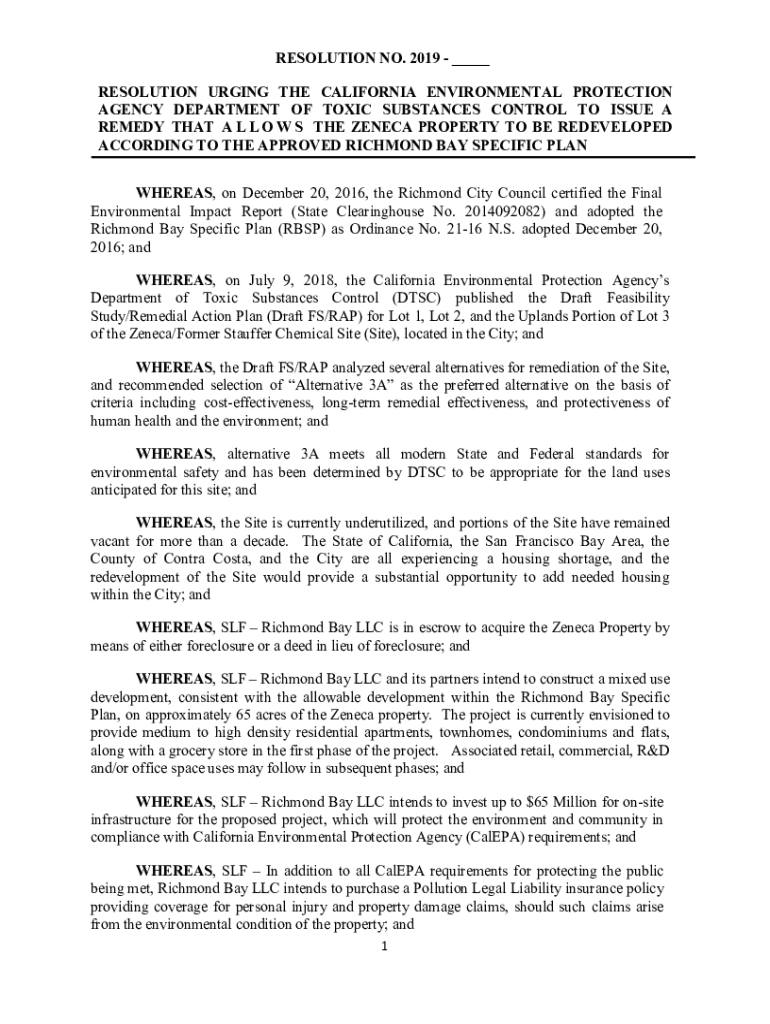 RESOLUTION NO. 2019 ___ RESOLUTION URGING THE CALIFORNIA ENVIRONMENTAL PROTECTION AGENCY DEPARTMENT OF TOXIC SUBSTANCES CONTROL TO ISSUE A REMEDY THAT A L L O W S THE SENECA PROPERTY TO BE REDEVELOPED