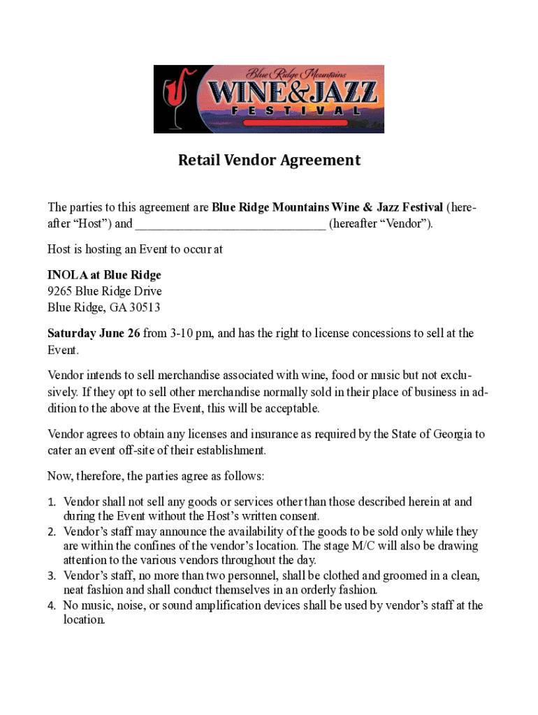 Retail Vendor Agreement The parties to this agreement are Blue Ridge Mountains Wine & Jazz Festival (hereafter Host) and ___ (hereafter Vendor). Host is hosting an Event to occur at NOLA at Blue Ridge