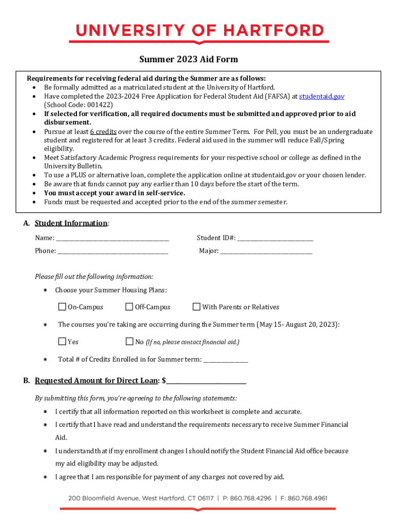 Summer 2023 Aid Form Requirements for receiving federal aid during the Summer are as follows: Be formally admitted as a matriculated student at the University of Hartford. Have completed the 20232024