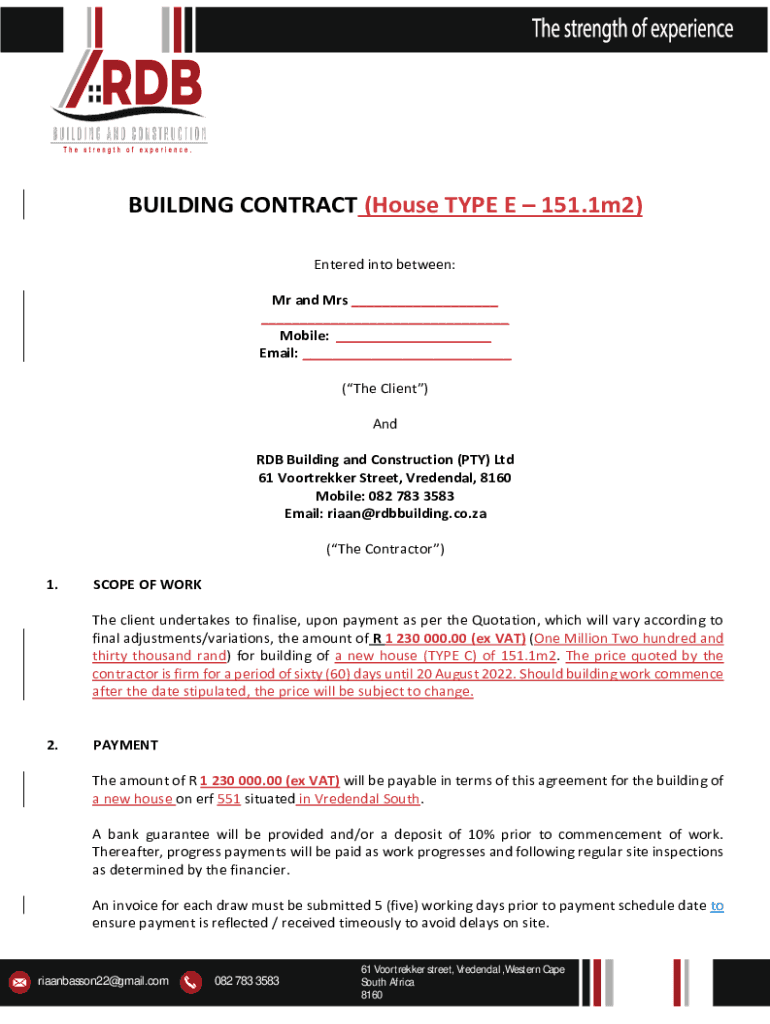 BUILDING CONTRACT (House TYPE E 151.1m2) Entered into between: Mr and Mrs ___ ___ Mobile: ___ Email: ___ (The Client) And RDB Building and Construction (PTY) Ltd 61 Voortrekker Street, Credential,