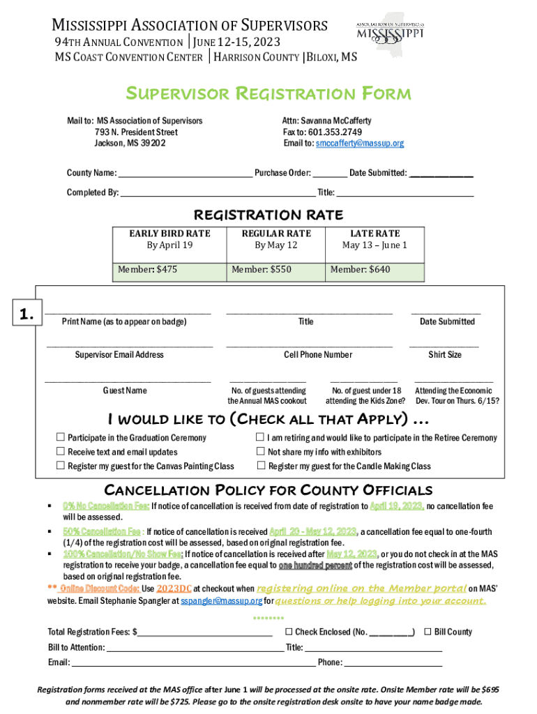MISSISSIPPI ASSOCIATION OF SUPERVISORS94TH ANNUAL CONVENTION JUNE 1215, 2023 MS COAST CONVENTION CENTER HARRISON COUNTY |BILOXI, SUPERVISOR REGISTRATION FORM Mail to: MS Association of Supervisors